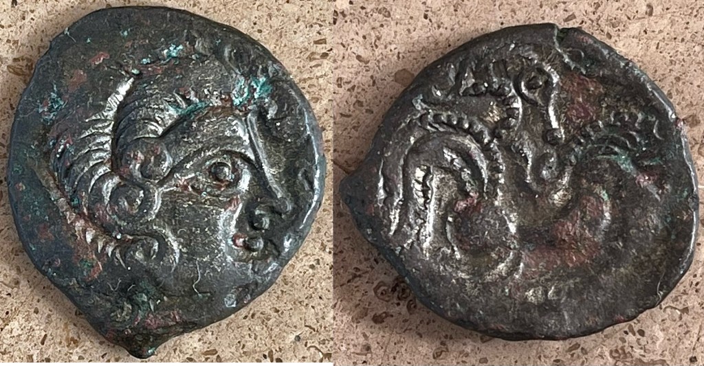 Billon Stater (c. 75-50 BC) (S16). Celtic Armorica .(Channel Islands and North-West Gaul). Type III Obverse: head with corded hair with anchor shaped nose. Reverse: stylised horse facing right with rider and Victory, lash ends in a loop, boar below. Grade aEF. Price AUS$800