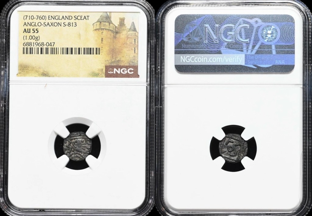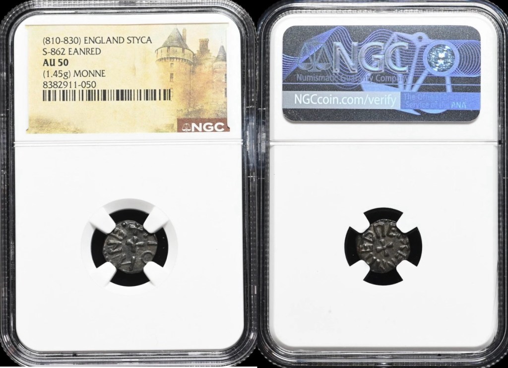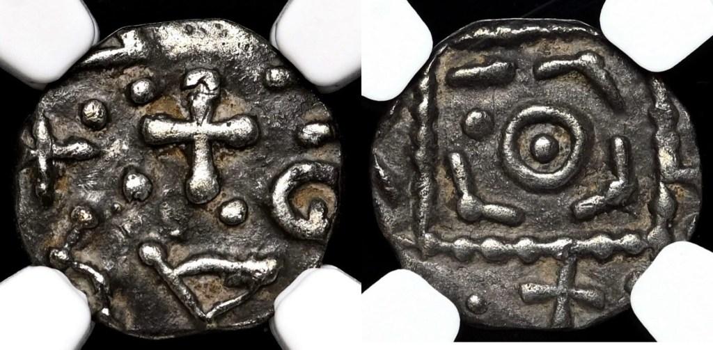 695-740 Anglo-Saxon silver Sceat (S793) Continental Issue. Obverse: highly stylised degenerate head often described as a porcupine design, representing a degraded portrait. Reverse: beaded square with central pellet in annulet with additional pellet and line and angles inside, representing a degraded Roman military standard. These early small thick coins were part of the transition from gold to silver currency. They were produced in the Netherlands or Frisia and circulated in Anglo Saxon England. A lovely example slabbed and graded by NGC. Grade XF45 (EF). Price AUS$735710-760 Anglo-Saxon silver sceatta (S813). Secondary Series R. Obverse: head without a neck and ‘C-shaped’ ear, possibly crowned and in royal regalia facing right, with symbols and small annulets to left and possibly runic inscription W for the moneyer Wigraed to right. Reverse: square standard with and large central annulet and diametrically opposite angles and lines inside. Fabulous head/portrait is a defining feature of this exciting coin. Slabbed and graded by NGC as aU55. Price AUS$2,600.810-830 Eanred Styca (S862) King of Northumbria. Obverse: lettering EANRED REX surrounding a cross central motif. Reverse: lettering MONNE surrounding central cross motif. After c 810 sceattas debased to a copper alloy called a Styca. This example is of superb quality and presentation. Slabbed and graded by NGC as aU50. Price AUS$1,300