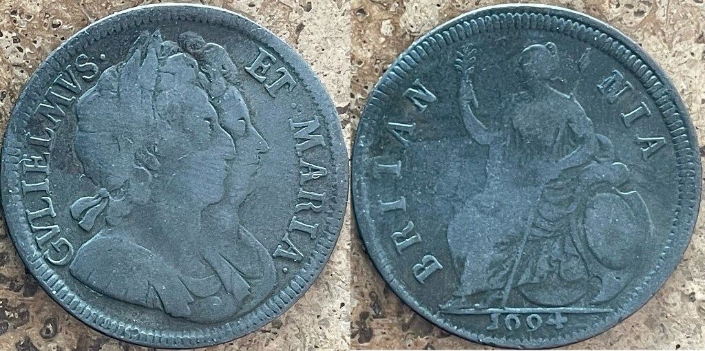 - 1694 William & Mary Halfpenny (S3452) rev stop F/aVF $165