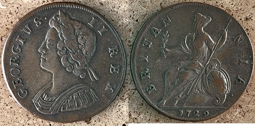 - 1734 George II Halfpenny (S3717) gF/F $60
