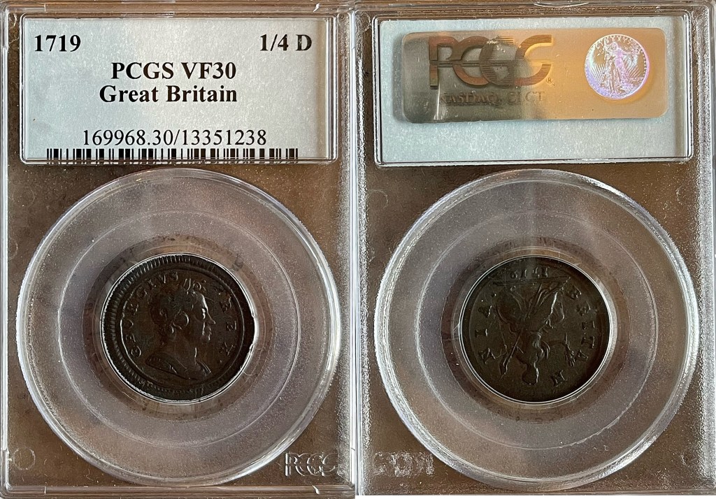 - 1724 George I Farthing (S3662) attractive gVF $570