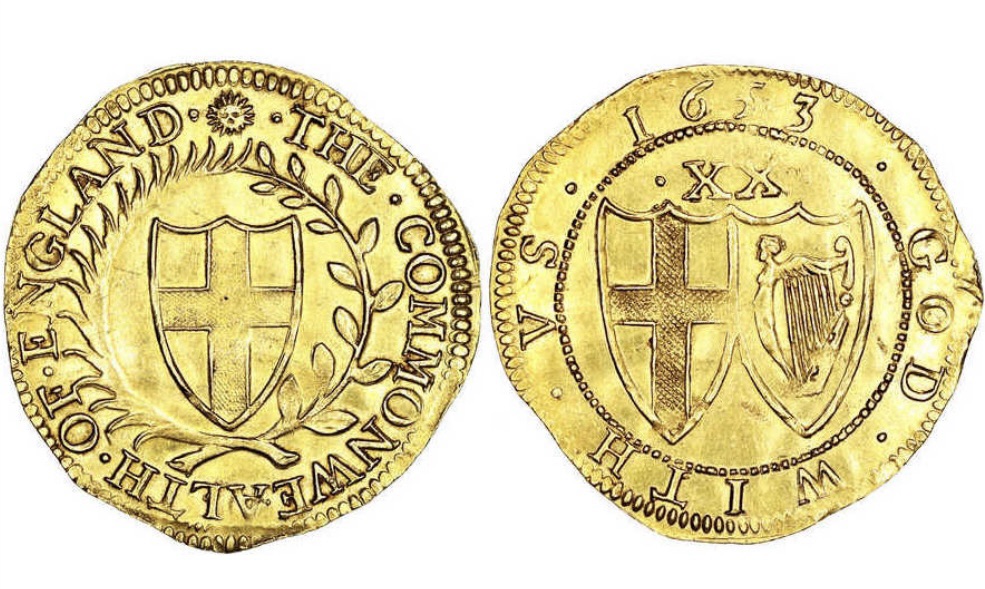 1604-1619 James I (and VI) Gold Unite (S2620). Second coinage. Mintmark cinquefoil. Obverse: Fifth bust looking right, IACOBVS D:G: MA: BRI: FRA: ET HI: REX. Reverse: Shield of arms of the House of Stuart, FACIAM: EOS: IN ENTEM: VNAM. Visually appealing with super portrait, some flat points on obverse but sharp devices indicative of extremely fine detail. A couple of elevated die folds on obverse and no scratches. Overall grade aEF. Price AUS$13,0001653 Commonwealth of England, Scotland and Ireland gold Unite (S3208) (8.90 gms, 35 mm) Royal Mint London. The Interregnum of 1649-1660 with Oliver Cromwell as Lord Protector. Obverse: kite shaped Escutcheon with the cross of St George within an untied wreath of laurel and palm, mintmark sun above, THE COMMONWEALTH OF ENGLAND around. Reverse: conjoined kite shaped Escutcheons if the Armorial of the Kingdom of Ireland on the right and the cross of St George on the left, value XX above, all within a beaded border, date above and GOD WITH VS around. This striking Unite is of utmost appeal and collectability, struck on a fairly round flan, even devices, some doubling on reverse but extremely pleasing in hand. Grade aEF/EF. Price AUS$33,000