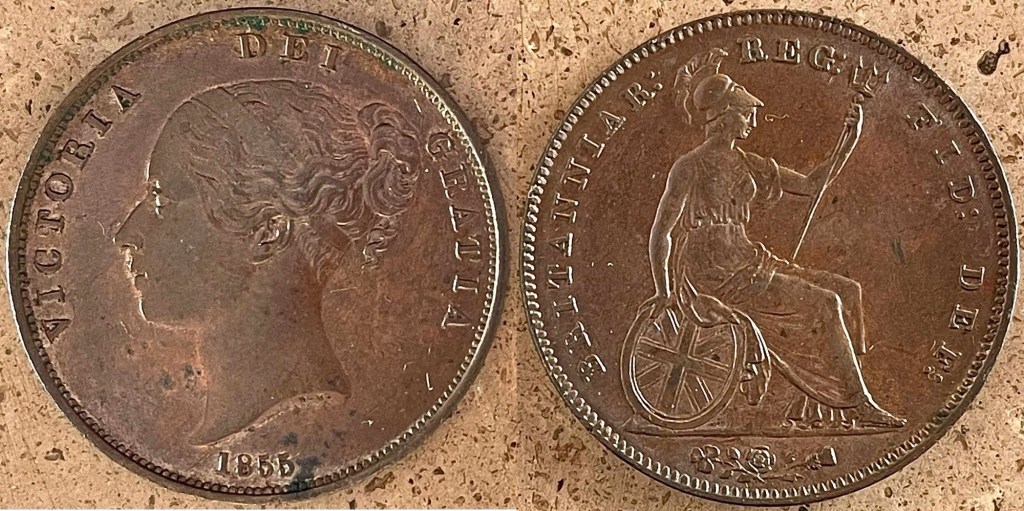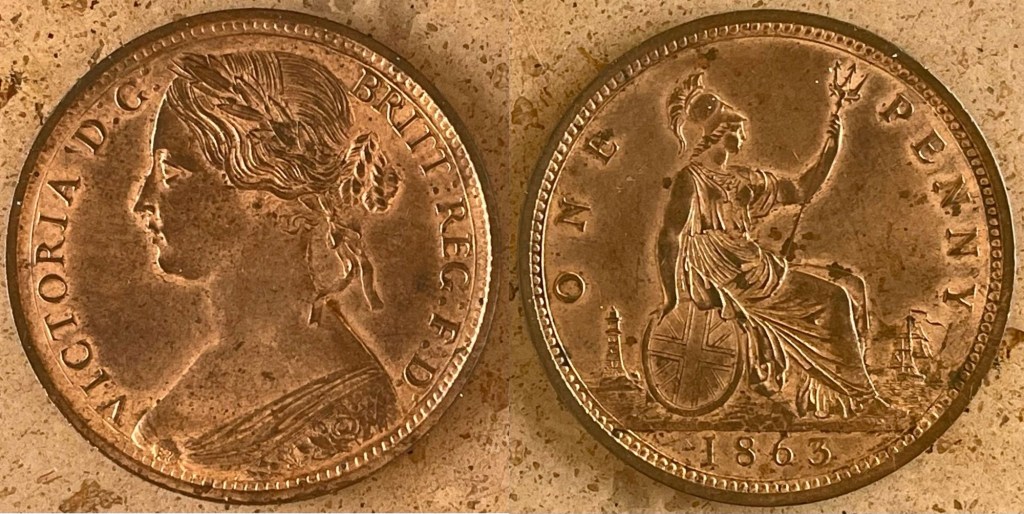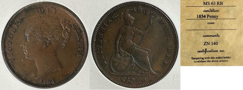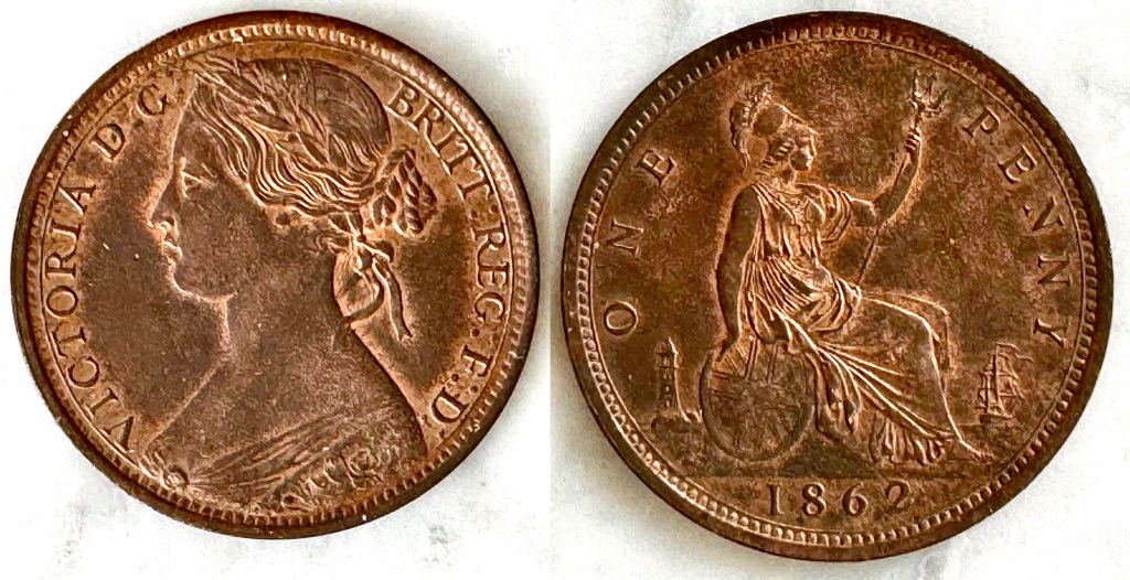 - 1862 Victoria Bun Penny (S3954) type 6G corrosion spots UNC/Choice UNC $560