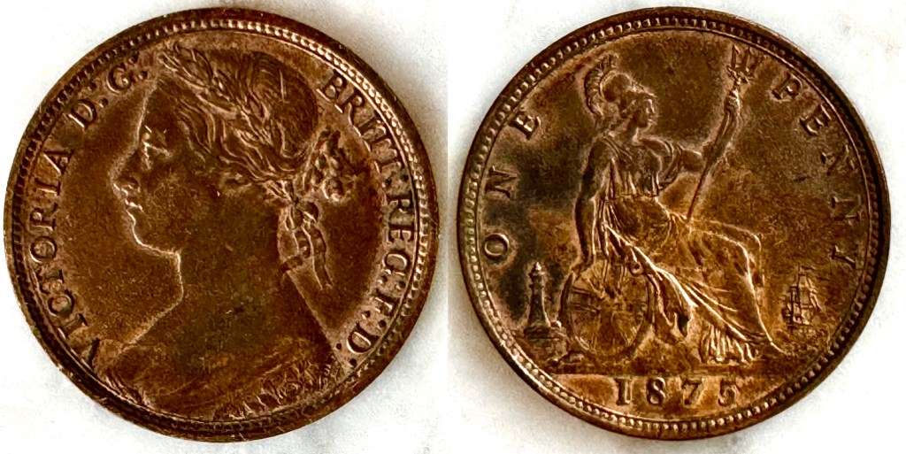 - 1875 Victoria Bun Penny (S3954) type 8J EF $220
