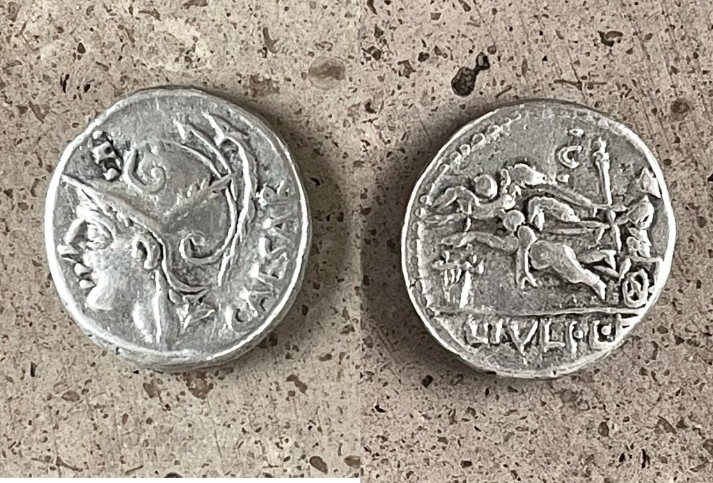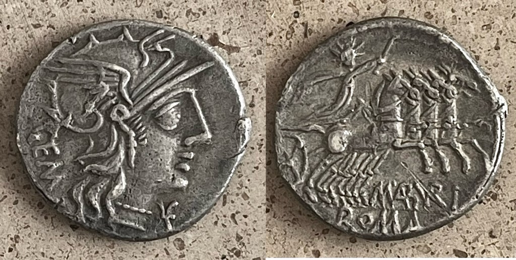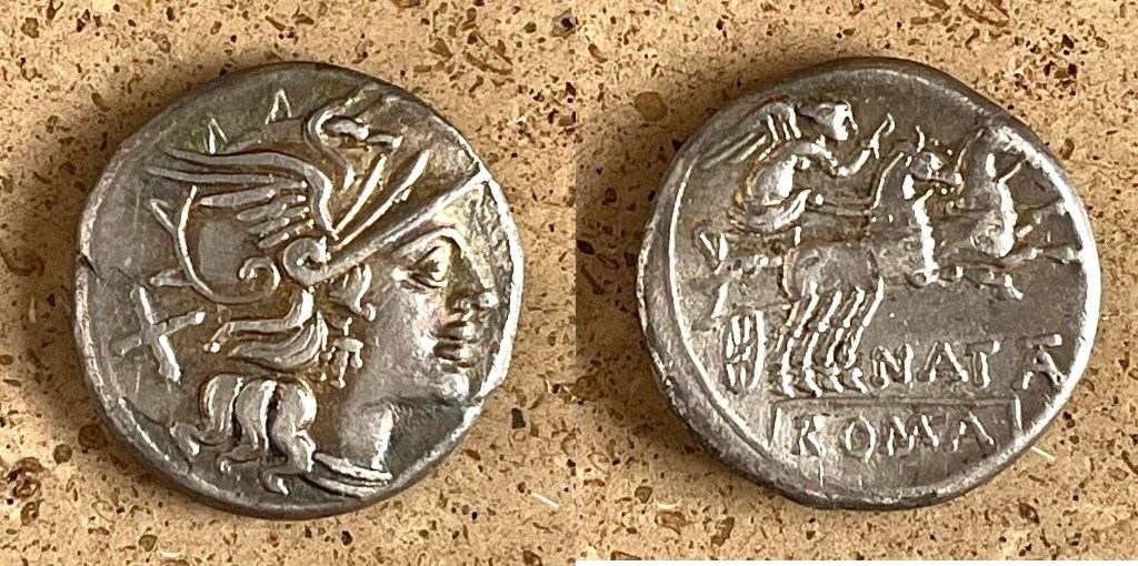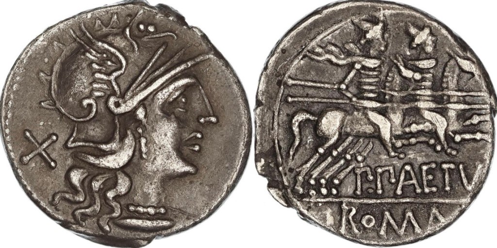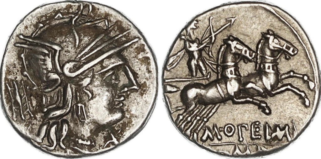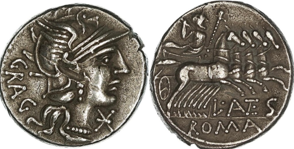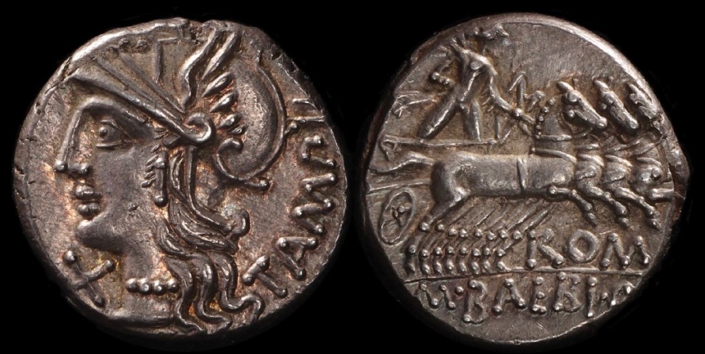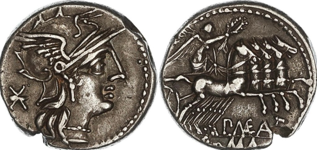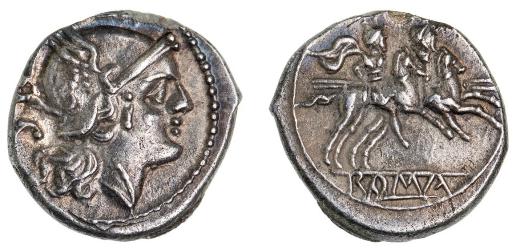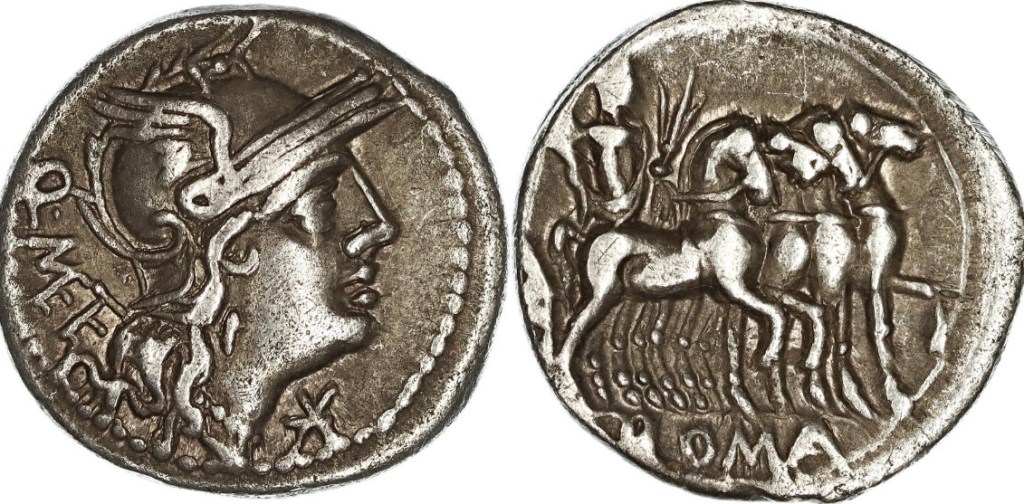 Anonymous (211-208 BC) silver sestertius (S46) 1.10 gms, Rome mint. Obverse: helmeted head of Roma facing right, border of dots. Reverse: Dioscuri travelling right, ROMA in linear frame on tablet, line border. Note sestertius discontinued c. 208 BC. Attractively toned, fairly well centredand rare. Grade aEF. Price AUS$1,280P. Cornelius Sulla (151 BC) silver denarius (S84). Obverse: helmeted head of Roma facing right with X behind. Reverse: Victory commanding biga travelling right, PSVLA (VL in monogram) below horses, ROMA in exergue. Lovely fully round example with lustrous surfaces and full lettering. Grade EF. Price: AUS$1,045Pinarius Natta (149 BC) silver denarius (S89). Obverse: helmeted head of Roma facing right. Reverse: Victory in biga travelling right, NATTA (TA in monogram) below horses, ROMA in exergue. Attractive fully round full lettering and light grey tone. Grade EF. Price AUS$1,045A. Spurilius (139BC) denarius (S107) as Triumvir Monetalis (moneyer) Rome mint, 3.77g, 18mm. Obverse: head of Roma facing right wearing winged Attic helmet, X (mark of value) behind. Reverse: Diana surmounted by crescent commands biga traveling right, A. SPVRI (VR ligate) below and ROMA in exergue. Nice original tone and obverse choice. Grade gVF+. Price AUS$560C. Renius (138BC) silver denarius (S108) as Triumvir Monetalis (moneyer) Rome mint, 3.56g, 18mm. Obverse: head of Roma looking right wearing winged Attic helmet, X (mark of value) behind. Reverse: Juno Capriotina commanding biga of goats travelling right, C. RENI below and ROMA in exergue. A bold example with original toning and full lettering. Grade gVF/aEF. Price AUS$625P. Aelius Q.n. Paetus (138BC) denarius (S110) as Triumvir Monetalis (moneyer) Rome mint, 3.56g, 19mm. Obverse: head of Roma looking right wearing winged Attic helmet, X (mark of value) behind. Reverse: the Discouri, Castor and Pollux, on horseback travelling right both holding spear pointed forwards, P.PAETVS below and ROMA in exergue. Grade gVF+. Price AUS$590M. Baebius Q.f. Tampilus (137BC) silver denarius (4.02 gms) (S113). Rome mint. Obverse: helmeted head of Roma looking left, X below chin, TAMPIL behind. Reverse: Apollo in quadriga to right holding laurel branch, bow and arrow, ROMA below, M BAEBI Q F in exergue. Choice example of this difficult issue with a wonderful tone. Grade Choice EF. Price AUS$1,170Cn Lucretius Trio (136BC) silver denarius 3.91g (S114), Rome mint. Obverse: helmeted head of Roma looking right, X below chin and TRIO behind. Reverse: the Dioscuri galloping right, CN LVCR below, ROMA in exergue. Attractive coin with light grey toning and lustrous reverse. Grade EF. Price AUS$870L. Antestius Gragulus (136BC) silver denarius (S115) as Triumvir Monetalis (moneyer), Rome mint, 3.79g, 19mm. Obverse: head of Roma looking right wearing winged Attic helmet, X monogram below chin, GRAG behind. Reverse: Jupiter holding sceptre and brandishing thunderbolt while commanding quadriga traveling right, L.ANTES (ANTE ligate) below, ROMA in exergue. Well centred and detailed example with full inscriptions, dark grey tone. Grade aEF. Price AUS$630Ti Minucius C.f. Augurinus (134 BC) silver denarius (S120) 3.81 gms. Obverse: helmeted head of Roma facing right, XVI monogram behind. Reverse: Iconic bronze column (Columna Minuciaoutside the Porta Trigemina in the Sevian Wall) between two togate figures, TI MINVCI left and AVGVRINI right, ROMA above. Well centred example with grey toning. Grade VF/gVF. Price AUS$475P. Maenius M.f. Antiaticus (132BC) silver denarius (S126) as Triumvir Monetalis (moneyer), Rome mint, 3.97g, 18mm. Obverse: head of Roma looking right wearing winged Attic helmet, X monogram (mark of value) behind. Reverse: Victory holding wreath and palm in quadriga traveling right, P. MAE ANT (MAE & ANT in monogram) below, ROMA in exergue. Deep original grey tone, small chip. Grade aEF. Price AUS$630M. Aburius M. f. Geminus (132 BC) silver denarius (S127). Obverse: helmeted head of Roma looking right, GEM behind, xVI monogram below chin. Reverse: Rad. Sol. holding whip in quadriga facing right, M ABVRI (AB and VR in monogram) below horses, ROMA in exergue. Attractive well centred coin with even deep grey tone, full inscriptions and 2 edge cuts on obverse. Grade aEF. Price AUS$550L. Postumius L.f. Albinus (131BC) silver denarius (S128) as Triumvir Monetalis (moneyer), Rome mint, 3.82g, 20.5mm. Obverse: head of Roma looking right wearing winged Attic helmet, X monogram XVI below chin, apex behind. Reverse: Mars in quadriga holding trophy, spear and shield, traveling right, L. POST ALB (AL ligate) below, ROMA in exergue. Well centred coin with grey tone and full inscriptions. Grade VF/gVF. Price AUS$455M. Opeimus Q.f. (131BC) silver denarius (S129) as Triumvir Monetalis (moneyer), Rome mint, 3.21g, 18mm. Obverse: head of Roma looking right wearing winged Attic helmet, X monogram XVI (mark of value) beneath chin, tripod behind. Reverse: Apollo holding bow and arrow in quadriga traveling right, M. OPEIMI below, ROMA in exergue. Light corrosion on obverse doesn’t detract from this bold and rare example. Grade EF. Price AUS$835Q. Caecilius Metellus (130 BC) silver denarius (S132) (3.77 gms, 19 mm) Rome mint. Obverse: head of Roma facing right wearing winged Attic helmet, mark of value below, Q METE (ME & TE ligate) behind. Reverse: Jupiter naked and holding thunderbolt and branch commands quadriga advancing slowly right, ROMA in exergue. Nice example with attractive patina, full inscriptions and well centred each side. Grade EF. Price AUS$1,035Q. Caecilius Metellus Balearicus (130 BC) silver denarius (S132) as Triumvir Monetalis (moneyer), 3.71g, 18mm, Rome mint. Obverse: head of Roma looking right wearing Attic helmet, X- monogram (mark of value) beneath chin, Q. METE (ME & TE ligate) behind. Reverse: Jupiter holding palm frond and thunderbolt in slow quadriga traveling right, ROMA in exergue. Attractive even grey toning and well centred. Grade gVF. Price AUS$52