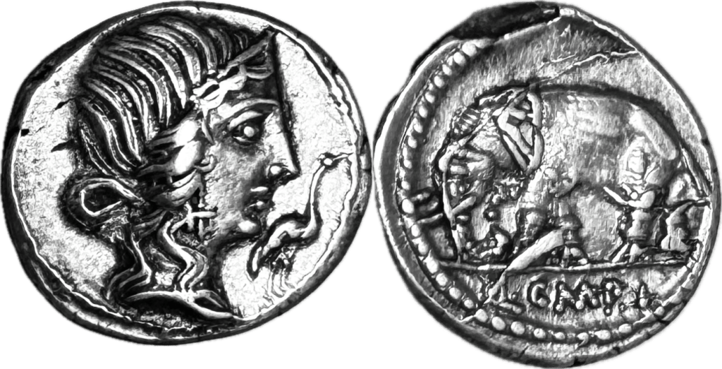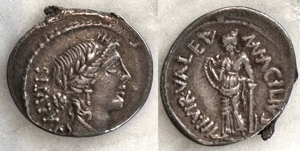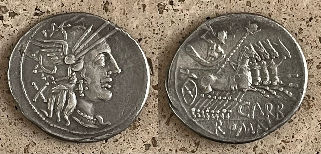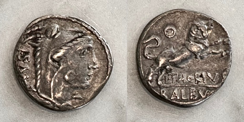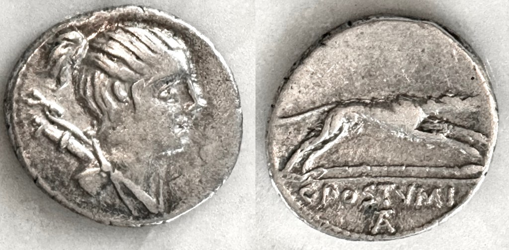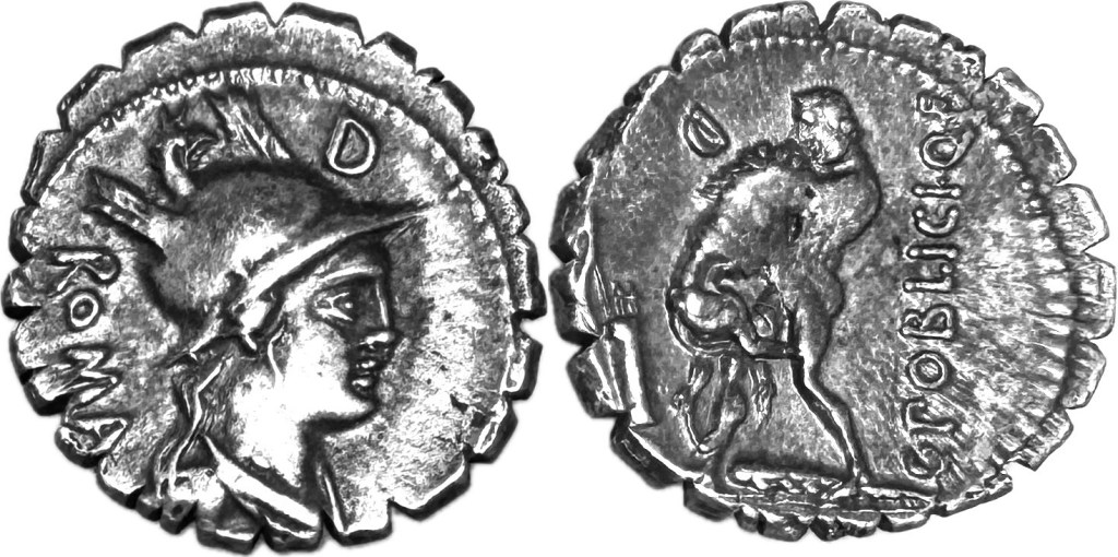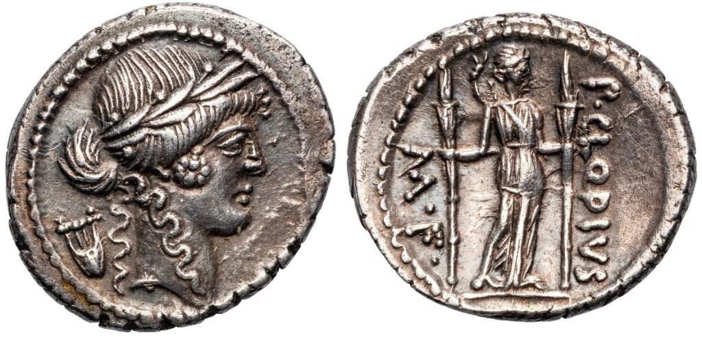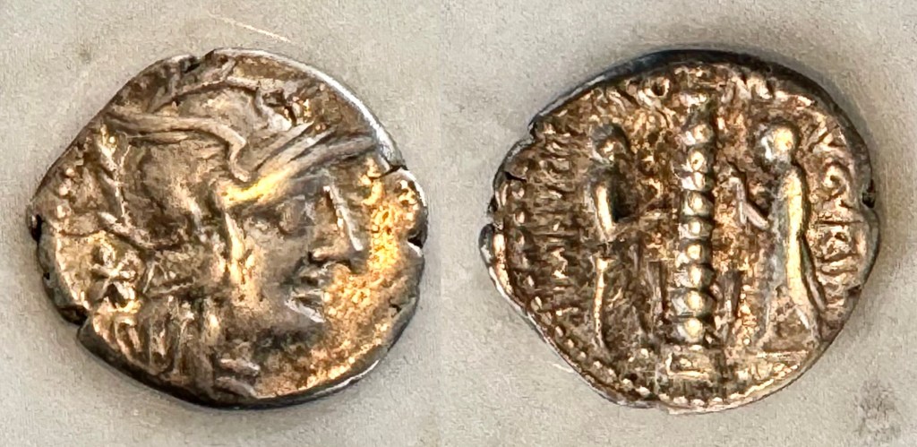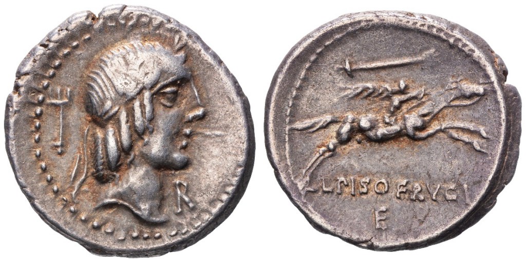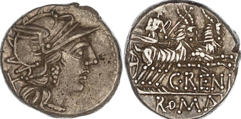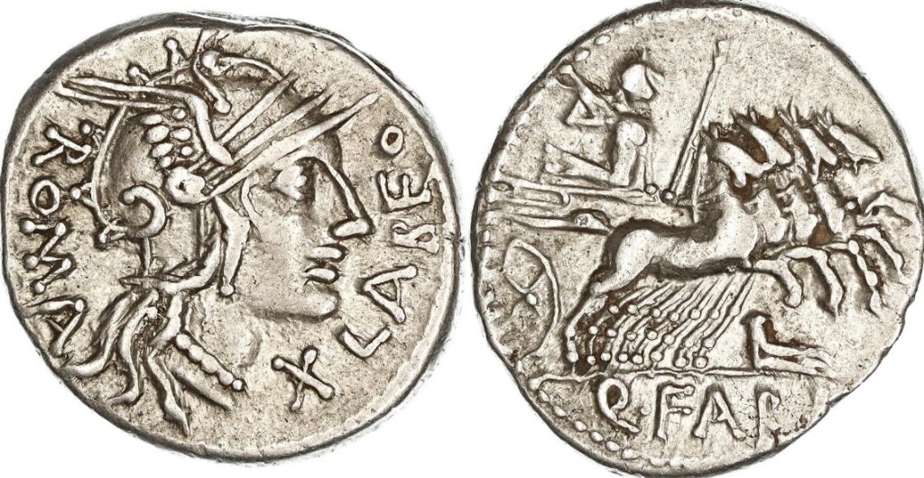 Anonymous (211-208 BC) silver sestertius (S46) 1.10 gms, Rome mint. Obverse: helmeted head of Roma facing right, border of dots. Reverse: Dioscuri travelling right, ROMA in linear frame on tablet, line border. Note sestertius discontinued c. 208 BC. Attractively toned, fairly well centredand rare. Grade aEF. Price AUS$1,280P. Cornelius Sulla (151 BC) silver denarius (S84). Obverse: helmeted head of Roma facing right with X behind. Reverse: Victory commanding biga travelling right, PSVLA (VL in monogram) below horses, ROMA in exergue. Lovely fully round example with lustrous surfaces and full lettering. Grade EF. Price: AUS$1,045Pinarius Natta (149 BC) silver denarius (S89). Obverse: helmeted head of Roma facing right. Reverse: Victory in biga travelling right, NATTA (TA in monogram) below horses, ROMA in exergue. Attractive fully round full lettering and light grey tone. Grade EF. Price AUS$1,045A. Spurilius (139BC) denarius (S107) as Triumvir Monetalis (moneyer) Rome mint, 3.77g, 18mm. Obverse: head of Roma facing right wearing winged Attic helmet, X (mark of value) behind. Reverse: Diana surmounted by crescent commands biga traveling right, A. SPVRI (VR ligate) below and ROMA in exergue. Nice original tone and obverse choice. Grade gVF+. Price AUS$560C. Renius (138BC) silver denarius (S108) as Triumvir Monetalis (moneyer) Rome mint, 3.56g, 18mm. Obverse: head of Roma looking right wearing winged Attic helmet, X (mark of value) behind. Reverse: Juno Capriotina commanding biga of goats travelling right, C. RENI below and ROMA in exergue. A bold example with original toning and full lettering. Grade gVF/aEF. Price AUS$625P. Aelius Q.n. Paetus (138BC) denarius (S110) as Triumvir Monetalis (moneyer) Rome mint, 3.56g, 19mm. Obverse: head of Roma looking right wearing winged Attic helmet, X (mark of value) behind. Reverse: the Discouri, Castor and Pollux, on horseback travelling right both holding spear pointed forwards, P.PAETVS below and ROMA in exergue. Grade gVF+. Price AUS$590M. Baebius Q.f. Tampilus (137BC) silver denarius (4.02 gms) (S113). Rome mint. Obverse: helmeted head of Roma looking left, X below chin, TAMPIL behind. Reverse: Apollo in quadriga to right holding laurel branch, bow and arrow, ROMA below, M BAEBI Q F in exergue. Choice example of this difficult issue with a wonderful tone. Grade Choice EF. Price AUS$1,170Cn Lucretius Trio (136BC) silver denarius 3.91g (S114), Rome mint. Obverse: helmeted head of Roma looking right, X below chin and TRIO behind. Reverse: the Dioscuri galloping right, CN LVCR below, ROMA in exergue. Attractive coin with light grey toning and lustrous reverse. Grade EF. Price AUS$870L. Antestius Gragulus (136BC) silver denarius (S115) as Triumvir Monetalis (moneyer), Rome mint, 3.79g, 19mm. Obverse: head of Roma looking right wearing winged Attic helmet, X monogram below chin, GRAG behind. Reverse: Jupiter holding sceptre and brandishing thunderbolt while commanding quadriga traveling right, L.ANTES (ANTE ligate) below, ROMA in exergue. Well centred and detailed example with full inscriptions, dark grey tone. Grade aEF. Price AUS$630Ti Minucius C.f. Augurinus (134 BC) silver denarius (S120) 3.81 gms. Obverse: helmeted head of Roma facing right, XVI monogram behind. Reverse: Iconic bronze column (Columna Minuciaoutside the Porta Trigemina in the Sevian Wall) between two togate figures, TI MINVCI left and AVGVRINI right, ROMA above. Well centred example with grey toning. Grade VF/gVF. Price AUS$475P. Maenius M.f. Antiaticus (132BC) silver denarius (S126) as Triumvir Monetalis (moneyer), Rome mint, 3.97g, 18mm. Obverse: head of Roma looking right wearing winged Attic helmet, X monogram (mark of value) behind. Reverse: Victory holding wreath and palm in quadriga traveling right, P. MAE ANT (MAE & ANT in monogram) below, ROMA in exergue. Deep original grey tone, small chip. Grade aEF. Price AUS$630M. Aburius M. f. Geminus (132 BC) silver denarius (S127). Obverse: helmeted head of Roma looking right, GEM behind, xVI monogram below chin. Reverse: Rad. Sol. holding whip in quadriga facing right, M ABVRI (AB and VR in monogram) below horses, ROMA in exergue. Attractive well centred coin with even deep grey tone, full inscriptions and 2 edge cuts on obverse. Grade aEF. Price AUS$550L. Postumius L.f. Albinus (131BC) silver denarius (S128) as Triumvir Monetalis (moneyer), Rome mint, 3.82g, 20.5mm. Obverse: head of Roma looking right wearing winged Attic helmet, X monogram XVI below chin, apex behind. Reverse: Mars in quadriga holding trophy, spear and shield, traveling right, L. POST ALB (AL ligate) below, ROMA in exergue. Well centred coin with grey tone and full inscriptions. Grade VF/gVF. Price AUS$455M. Opeimus Q.f. (131BC) silver denarius (S129) as Triumvir Monetalis (moneyer), Rome mint, 3.21g, 18mm. Obverse: head of Roma looking right wearing winged Attic helmet, X monogram XVI (mark of value) beneath chin, tripod behind. Reverse: Apollo holding bow and arrow in quadriga traveling right, M. OPEIMI below, ROMA in exergue. Light corrosion on obverse doesn’t detract from this bold and rare example. Grade EF. Price AUS$835Q. Caecilius Metellus (130 BC) silver denarius (S132) (3.77 gms, 19 mm) Rome mint. Obverse: head of Roma facing right wearing winged Attic helmet, mark of value below, Q METE (ME & TE ligate) behind. Reverse: Jupiter naked and holding thunderbolt and branch commands quadriga advancing slowly right, ROMA in exergue. Nice example with attractive patina, full inscriptions and well centred each side. Grade EF. Price AUS$1,035Q. Caecilius Metellus Balearicus (130 BC) silver denarius (S132) as Triumvir Monetalis (moneyer), 3.71g, 18mm, Rome mint. Obverse: head of Roma looking right wearing Attic helmet, X- monogram (mark of value) beneath chin, Q. METE (ME & TE ligate) behind. Reverse: Jupiter holding palm frond and thunderbolt in slow quadriga traveling right, ROMA in exergue. Attractive even grey toning and well centred. Grade gVF. Price AUS$52