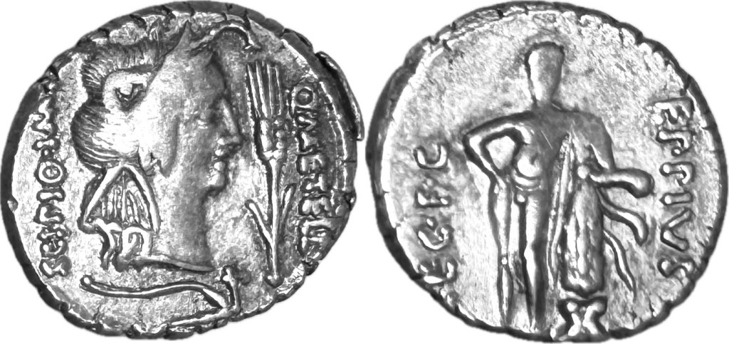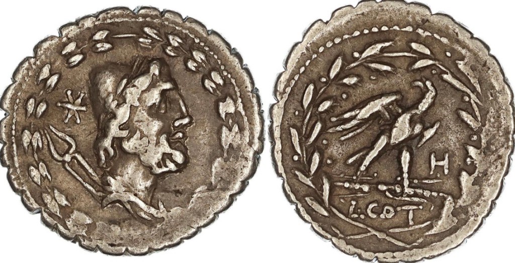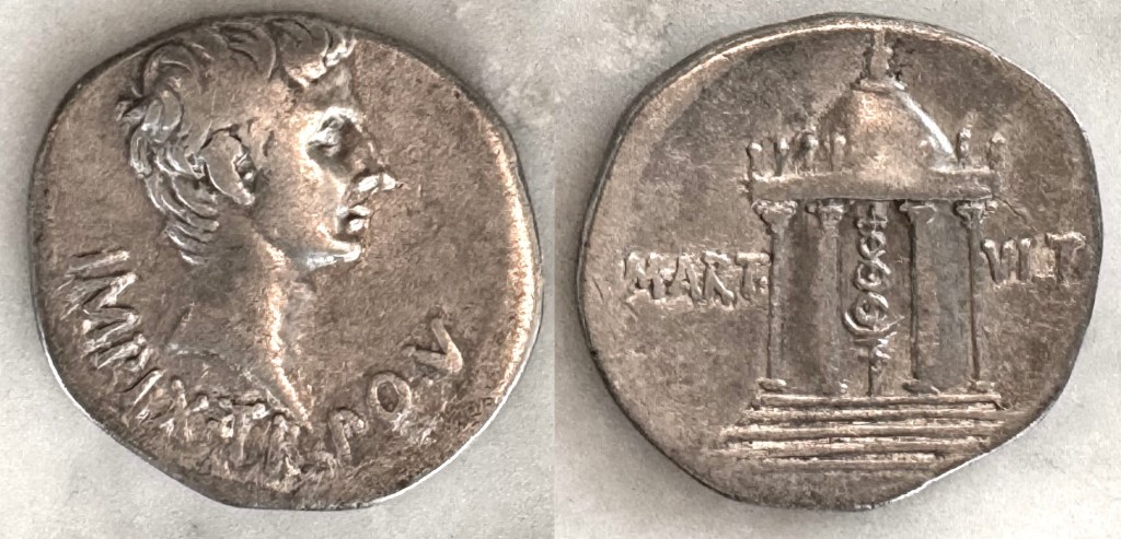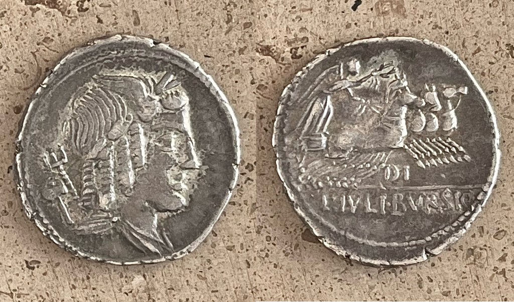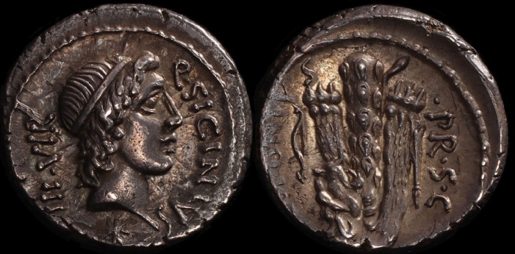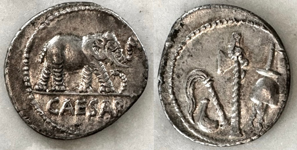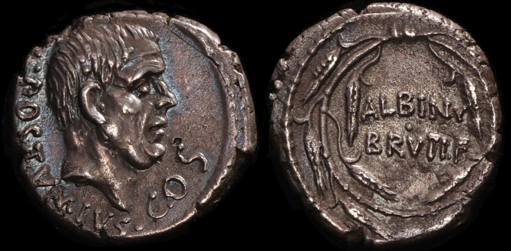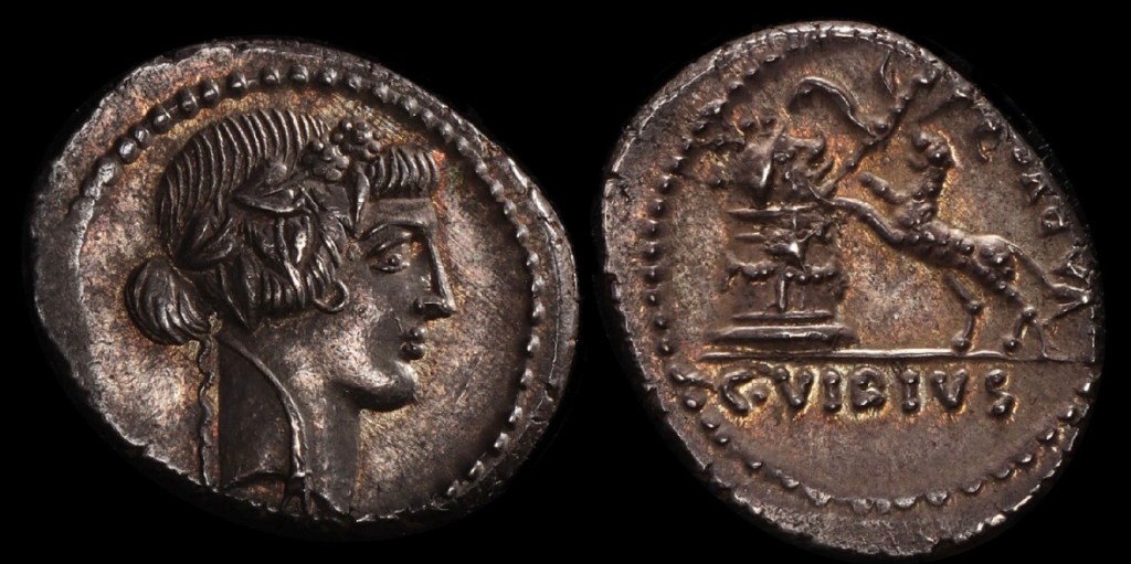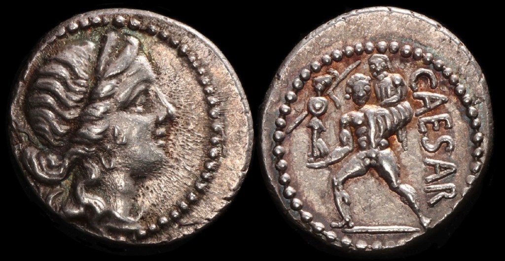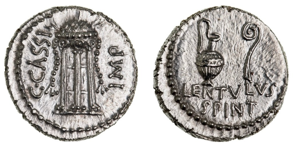 Q. C. Metellus Pius Scipio (46BC) silver denarius (3.86 gms) (S1380). Obverse: head of Africa looking right, laureate and clad in an elephant’s skin, corn ear before, plough below, Q METELL in front, SCIPIO IMP behind. Reverse: naked Hercules standing facing right, right hand on hip, resting on club set on rock, EPPIVS right, LEG F C left. Good example with even gunmetal grey toning and very scarce. Grade gVF. Price AUS$1,555Julius Caesar 49-44 BC silver denarius 3.89gms (S1399). Military mint traveling with Caesar struck April-August 49BC. First of the 12 Caesars. Obverse: elephant advancing right trampling on horned serpent, CAESAR in exergue. Reverse: Emblems of the pontificate: simpulum, sprinkler, axe & apex. Choice example of this highly sought after issue with very attractive patina showing considerable original silvering- rare in this grade and condition. Grade EF/gEF. Price AUS$9,200Julius Caesar (46-45 BC) silver denarius (3.92 gms) (S1402). Military mint traveling with Caesar in North Africa. Obverse: diademed head of Venus looking right. Reverse: Aeneas advancing left, head facing, holding palladium and bearing his father Anchises on his left shoulder, CAESAR emblazoned behind. High quality for this popular issue. Grade aEF/EF. Price AUS$5,225Brutus (42 BC) silver denarius (S1433) 3.80 gms, mint moving with Brutus and Cassius in southwestern Asia Minor. Minted spring to early summer 42 BC. Obverse: veiled and draped head of Liberty facing right., L. SESTI PRO Q (Proqueastor Lucius Sestius) around. Reverse: tripod between axe and simpulum, Q. CAEPIO BRVTVS PRO COS (Pro Consul) around. Brutus was famous for his leading role in the murder of Julius Caesar on the Ides of March 44 BC hoping to save the Republic. Highly sought after coin with attractive deep cabinet toning, good metal, and choice feel with some elements EF and other devices VF. Provenance: Ex Anthony Taylor Collection, CNG auction 105, lot 739. Grade gVF Price AUS$7,570C. Cassius Longinus (died 42 BC) silver denarius (S1446) issued spring of 42 BC, military mint in the East (probably Smyrna) 3.76 gms. Obverse: tripod surmounted by cauldron and two laurel branches, fillet hanging either side, dotted border, C. CASSI IMP around. Reverse: jug and lituus (emblems of the augurate) with LENTVLVS SPINT (P. Coenelius Lentulus Spinther legate) below and dotted border. Cassius is credited with organising the plot to murder Julius Caesar and participated in the killing. A super and sought after coin, extremely rare in this lustrous virtually mint condition – best seen. Provenance: Ex Anthony Taylor Collection. Grade gEF. Price AUS$31,400Mark Antony and Octavia (40-36BC) silver cistophorus 11.3gms (S1513). Obverse: conjoined heads of Mark Antony and Octavia facing right, M ANTONIVS IMP COS DESIG ITER ET TERT. Reverse: Dionysus holding cantharus and thyrus, standing on cista mystica facing left and flanked by two snakes, III VIR left, R P C to right. (Mark Antony married Octavia in 40 BC but took up with Cleopatra around four years later). Lovely example of this very scarce issue with dark grey toning. Grade gVF. Price AUS$3,970Octavian & Divus Julius Caesar (38 BC) bronze sestertius or dupondius (11.19 gms) (c/f S1569). Southern Italian mint? Obverse: wreathed head of Julius Caesar looking right, DIVOS IVLIVS. Reverse: bare head Octavian looking right, CAESAR DIVI F. Nice round coin and good portraits for this rare issue. Grade aVF. Price AUS$3,490