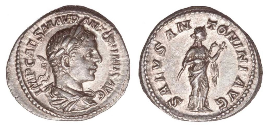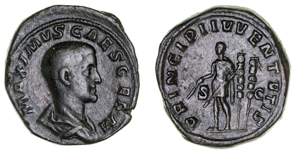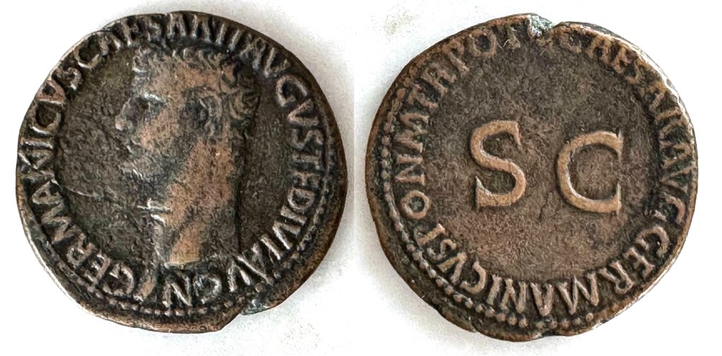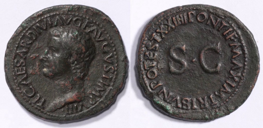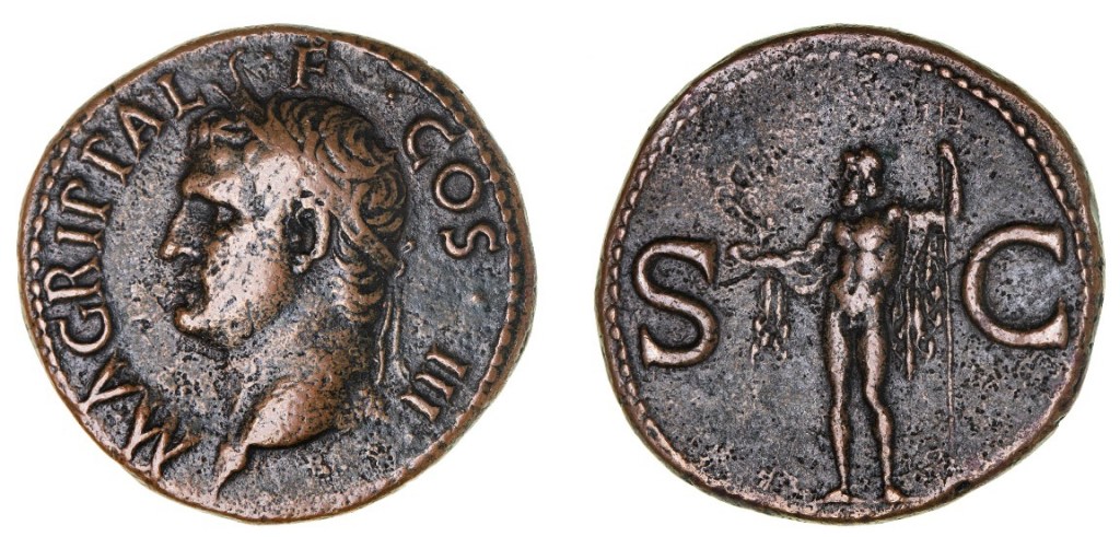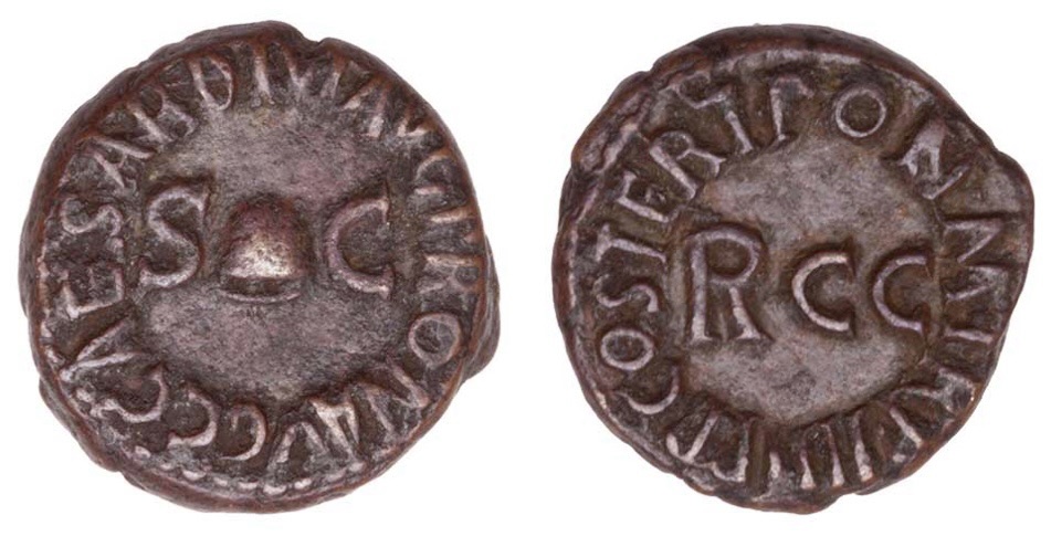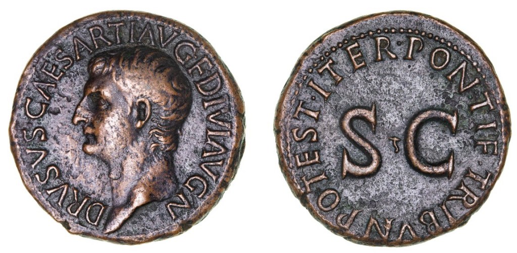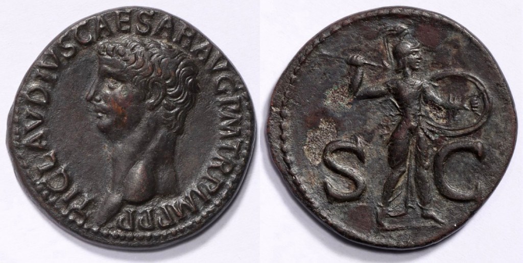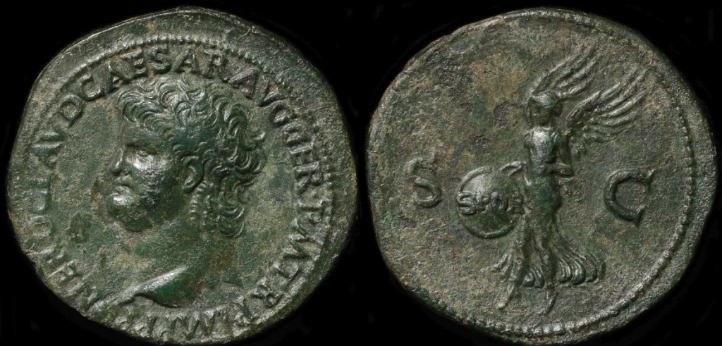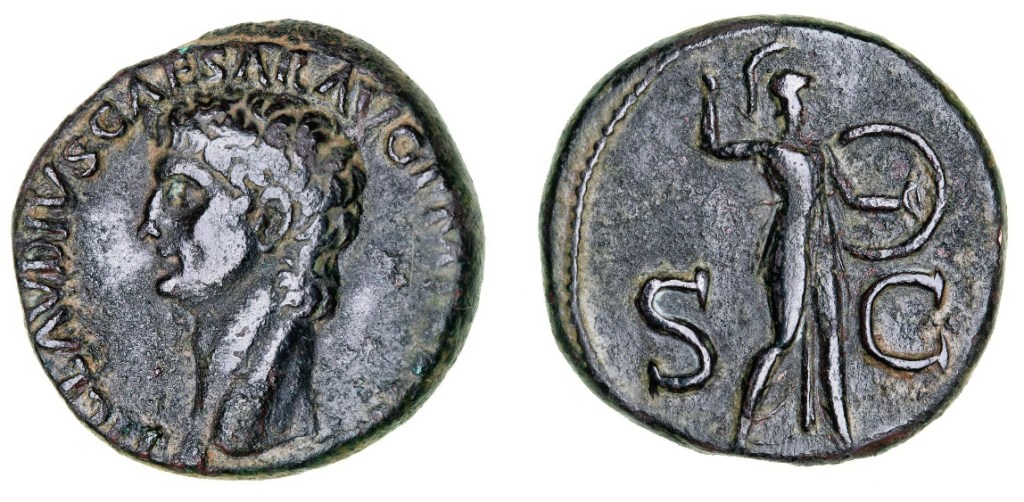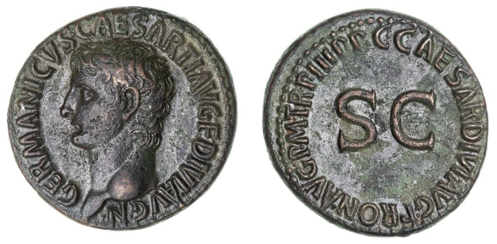 Augustus (27BC – 14AD) silver cistophorus (S1589). Struck c. 19 BC (11.6 gms, 25 mm). Obverse type a: bare head of Augustus looking right, IMP IX TR PO V. Reverse: domed temple of Mars Ultor containing legendary standards of Crassus and Antony recovered by Augustus from Phraates IV of Parthia, MART to left VLTO to right . A scarce issue with very light toning. Grade VF. Price AUS$2,970Augustus (27 BC – 14 AD) silver denarius (S1596). First Roman Emperor. Obverse: laureate head of Augustus looking right, AVGVSTVS behind DIVI F in front. Reverse: Gaius Caesar galloping right, legionary eagle between standards behind, C CAES above, AVGVS F in exergue. Lovely example with bold portrait, well centred and even grey toning Grade gVF. Price AUS$2,045Augustus (27BC – 14AD) silver denarius (3.83 gms) (S1615). Rome mint, L Caninius Gallus moneyer, struck 12 BC. Obverse: bare head of Augustus looking right, AVGVSTUS in front. Reverse: bearded and cloaked barbarian kneeling right, offering vexillum and extending hand, L CANINIVS GALLVS III VIR. Fully round, great portraits and nice detail with slight roughness but good example of scarce issue. Grade aEF. Price AUS$4,540Tiberius (14-37 AD) bronze As (11.23gms) (S1770). Rome mint, issued 22-23 AD. Obverse: bare head looking left, TI CAESAR DIVI AVG F AVGVST IMP VIII. Reverse: large SC in centre, PONTIF MAXIM TRIBVN POTEST XXIIII. Round with dark tone and full inscriptions, nice example. Grade gVF. Price AUS$1,830Drusus – son of Tiberius (died 23 AD) copper as (S1794) Rome mint issued under Tiberius in 22-23 AD (10.97 gms). Obverse: bare head of Drusus facing left, DRVSVS CAESAR TI AVG F DIVI AVG N around. Reverse: SC in centre, PONTIF TRIBVN POTEST ITER around. Attractive dark patina. Provenance: Ex Anthony Taylor Collection. Grade gVF. Price AUS$1,720Caligula (full name Gaius Julius Caesar Germanicus) (37-41AD) copper as (S1803) Rome mint, issued 37-38AD, 11.02 gms. Obverse: bare head of Caligula facing left, C CAESAR AVG GERMANICVS PON M TR POT around. Reverse: Vesta veiled and draped, seated to left on ornamental throne holding paterna and transverse sceptre, SC split left and right and VESTA above. Attractive brown patina and sought after coin. Grade VF. Price AUS$1,705Caligula (37-41 AD) bronze quadran (S1804). Struck 40 AD. 16 mm, 2.4 gms. Obverse: C CAESAR DIVI AVG PRON AVG around SC divided by pileus. Reverse: PON M TR P IIII P P COS TER T around RCC. Quadran is a quarter of a copper As. A nice example with full inscriptions. Provenance: Rare Coins Melbourne > Victoria collector. Grade gVF. Price AUS$490Agrippa (posthumous died 12 BC) issued under Caligula (37-41 AD) copper as ( S1812) 10.83 gms. Obverse: head of Agrippa facing left wearing rostral crown, M. AGRIPPA L F COS III around. Reverse: Neptune standing to left holding dolphin and trident, SC split either side. Attractive dark brown patina and minor pitting. Provenance: Ex Anthony Taylor Collection, CNG auction 412 lot 465, Matthew Rich Collection, Ex Spink Numismatic Circular XCV 4 (May 1987) lot 2879. Grade gVF. Price AUS$1,620Germanicus (15BC-19AD) issued under Caligula (37-41AD) copper as (S1821, RIC 35). Obverse: bare head of Germanicus looking left, GERMANICVS CAESAR TI AVGVST F DIVI AVG N around. Reverse: large SC in centre, C CAESAR AVG GERMANICVS PON M TR POT around . Issued by Caligula in honour of his deceased father Germanicus. Damage to the neck of Germanicus is thought to be a common political attack on Caligula. Otherwise a nice round coin with full legends. Grade VF/gVF. Price $AUS1,295Germanicus (15 BC – 19 AD) under Caligula (37-41 AD) copper as (S1822) Rome mint issued 37-38 AD, 12.18 gms. Obverse: bare head of Germanicus facing left, GERMANICVS CARSAR TI AVGVST F DIVI AVG N around. Reverse: SC in centre with C CAESAR DIVI AVG PRON AVG P M TR POT IIII P P around. Delightful brown patina graded extremely fine by Noble. Provenance: Ex Spink & Son London 1986, private purchase. Grade EF. Price AUS$2,915Claudius (41-54 AD) bronze As (10.41gms) (S1862). Rome mint, issued 41-42 AD. Obverse: bare head looking left, TI CLAVDIVS CAESAR AVG P M TR P IMP P P. Reverse: Minerva standing to right helmeted and draped, hurling javelin and holding shield, SC either side. Deep green patina with some surface pitting on reverse but still very attractive. Grade aEF. Price AUS$1,400Claudius (41-54 AD) copper as (S1862) 10.53 gms, Rome mint issued 41-42 AD. Obverse: bare head of Claudius facing left, TI CLAVDIVS CAESAR AVG PM TR P IMP P P around. Reverse: Minerva advancing right brandishing spear and holding shield, SC split across lower area. Pleasing forest green patina . Grade VF+. Price AUS$1,025Antonia (died 37 AD) brass dupondius (S1902) issued after her death by Claudius in 41-42 AD, Rome mint (15.36 gms). Obverse: draped bust of Antonia facing right, ANTONIA AVGVSTA around. Reverse: Claudius veiled and togate standing left holding simpulum splitting SC across field and TI CLAVDIVS CAESAR AVG P M TR P IMP around. Antonia was daughter of Mark Antony and Octavia, grandmother of Caligula and mother of Claudius. This rare coin has attractive toning and strong portrait. Grade gVF. Price AUS$3,070Nero (54-68 AD) brass dupondius (c/f S1969). Obverse: head of Nero looking right; IMP NERO CLAVD CAESAR AVG GERPMTRPIMPP. Reverse: Victory advancing left holding wreath, mark of value II in exergue; VICTORIA AVGVSTI, S C either side. Nice round coin with full inscriptions and even tone. Grade gVF. Price AUS$2,075Nero (54-68 AD) bronze As (11.43gms) (c/f S1976). Rome mint, issued circa 65 AD. Obverse: bare head of Nero looking left, IMP NERO CAESAR AVG P MAX TR P P P. Reverse: Victory flying left holding shield inscribed SPQR, S C either side. An amazing example of this scare issue with a strong portrait and wonderful reddish-green patina. Grade EF. Price AUS$2,270Vitellius (69 AD) denarius (3.15 gms) (S2196). Rome mint, struck circa April-December. Obverse: bare head looking right, A VIT